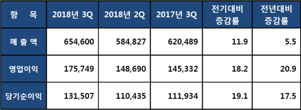 삼성전자는 31일 2018년 3분기 경영실적을 공시했다. 이에 따르면 매출은 65조4,600억원으로 전년동기대비 5.5% 증가했고, 영업이익은 17조5,749억원으로 전년동기대비 20.93% 증가했다. 당기순이익은 13조1,507억원으로 전년동기대비 17.49% 증가했다.