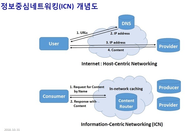 기존 인터넷 통신에는 TCP/IP방식이 주로 사용됐다. 하지만 이 방식은 IP주소 기반 기기중심 네트워킹이 이뤄져야 되기 때문에 IoT에서 IoE로 넘어가는 과정에서 수많은 데이터를 효과적으로 처리하기에는 적절치 않다. 그래서 나온 개념이 정보중심 네트워킹(ICN)이다. 얻고자 하는 데이터를 더 이상 기기중심이 아닌 데이터나 정보중심 네트워킹을 통해 얻겠다는 것이다.