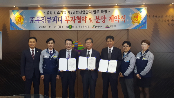 전라북도와 익산시는 8일 익산시청 홍보관에서 정헌율 익산시장, 차주하 전라북도 투자유치과장 등이 참석한 가운데 우진큐피디와 전라북도 익산에 공장 신설 투자에 대한 투자협약을 체결했다.