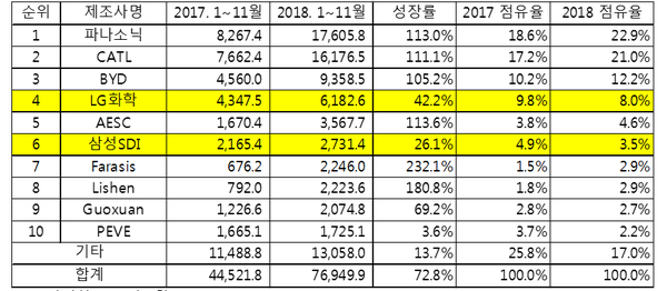 2018년 11월 전세계 전기차 출하량은 약 12.5GWh로 전년동월대비 40.8% 성장했다. 업체별로 CATL과 파나소닉, BYD가 1~3위를 차지한 가운데 LG화학은 4위를 유지했다. 다만, 삼성SDI는 중국계 업체들의 공세에 밀려 11위에 그치면서 TOP 10에서 벗어났다.