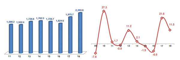 산업통상자원부가 17일 발표한 2018년 ICT 수출입 동향에 따르면 수출은 전년대비 11.5% 증가한 2,204억달러, 수입은 4.9% 늘어난 1,071억달러로 무역수지 흑자는 1,133억달러를 기록한 것으로 잠정 집계됐다. ICT 수출은 24개월 연속 수출증가세를 기록하면서 사상 최초로 2,200억달러대를 돌파하며 2년 연속 연간 최대실적을 달성하게 됐다.