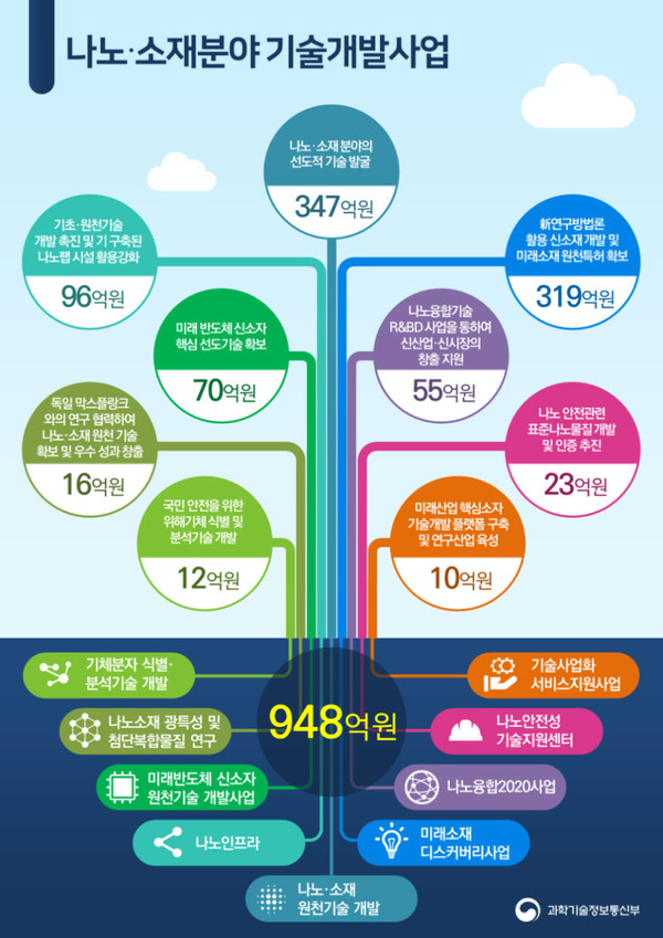 과학기술정보통신부(장관 유영민)은 ‘2019년도 나노·소재 분야 사업 시행계획’을 확정하고 올해 948억원의 연구개발 예산을 투입할 계획이라고 밝혔다. 올해 예산은 전년대비 약 12%(104억원) 늘어났다.