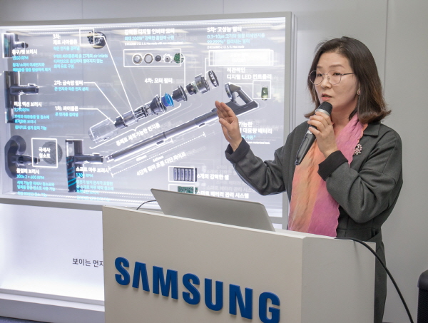 ▲ (좌측부터)청소기 상품기획담당 정유진 상무가 `삼성 제트`를 소개하고 있다.삼성전자의 프리미엄 무선청소기의 최고 출고가는 139만9,000원에 이를 것으로 보인다.