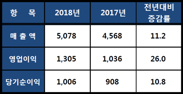 이에 따르면 매출액은 5,078억원으로 전년대비 11.2% 증가했고, 영업이익은 1,305억원으로 전년대비 26% 증가했다. 당기순이익은 1,006억원으로 전년대비 10.8% 증가했다.