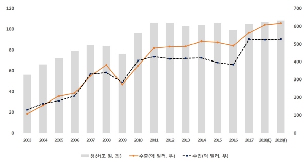 ▲ 우리나라 기계산업의 생산 및 수출입 추이와 2019년 전망한국기계연구원(원장 박천홍)이 2019년 국내 기계산업이 건설기계 업종의 호황을 중심으로 소폭 성장세를 이어가며 정중동의 움직임을 보일 것으로 전망했다.