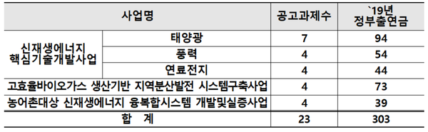 이번 사업은 △신재생에너지핵심기술개발사업 △농어촌대상 신재생에너지 융복합시스템 개발·실증사업 △고효율바이오가스 생산기반 지역분산발전 시스템 구축사업 등 총 23개 과제다. 산업부는 올해 303억원을 시작으로 향후 3~4년간 약 1,300억원을 지원할 예정이다.