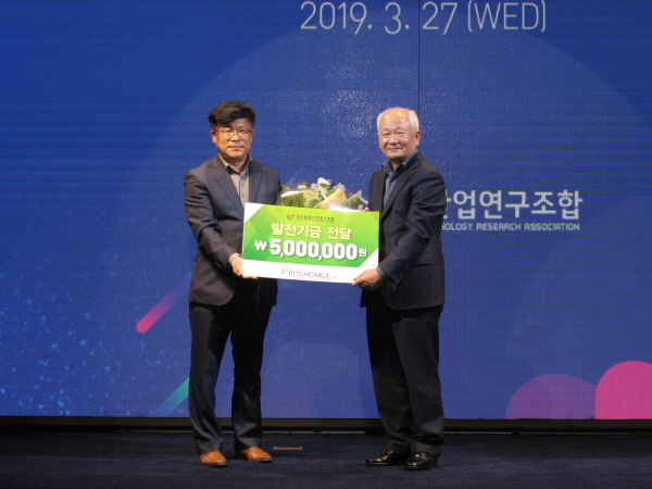 ▲ (왼쪽)임동욱 피치케이블 대표이사가 유영목 탄소조합 이사장에게 발전기금을 전달하고 있다.