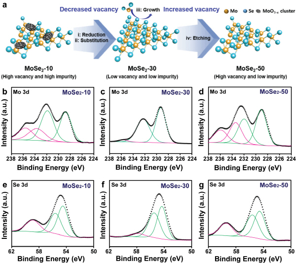 UNIST(총장 정무영) 에너지 및 화학공학부의 박혜성, 김건태, 이준희 교수 공동연구팀은 전이금속 기반 촉매인 ‘이셀레나이드 몰리브덴(MoSe₂)’가 가지는 빈자리 결함(vacancy)을 조절해 수소발생반응이 촉진되는 원리를 밝혔다.