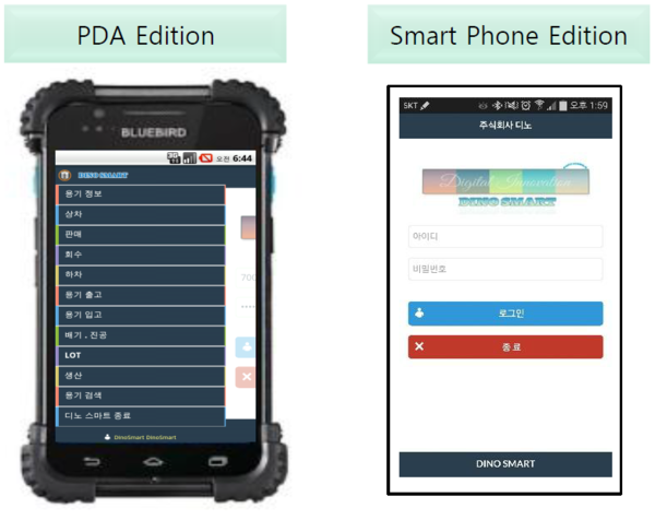 디노 스마트(모바일) 솔루션은 전용장비의 사용으로 실무에 최적화된 가장 합리적인 솔루션을 제안하고 있다. 더불어 PDA/스마트 폰 솔루션이 모두 개발돼 운영 중으로 업체에서 필요한 모듈을 구입해 실무에 적용하면 된다.