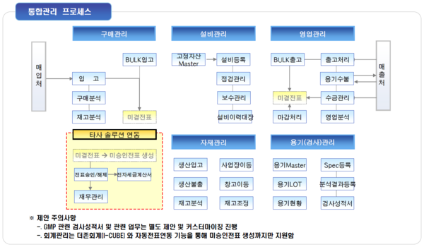 이외에도 고객사 ERP 연동 모듈 개발, 검사성적서 관리 등 커스터마이징 개발을 통해 최적의 확장성을 제공하고 있다.