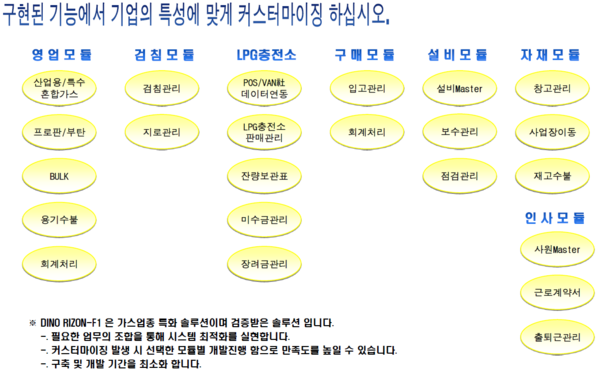 특히 디노 ERP는 가스업종 업무에 특화된 프로세스 제공으로 용기관리, 충전소 관리, 검침관리, 차량충전소관리 등 특수성을 반영했다.