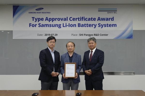 삼성중공업은 삼성SDI와 공동 개발한 ‘선박용 리튬이온배터리 시스템’이 국내 업계 최초로 노르웨이 선급인 DNV-GL로부터 형식승인을 획득했다고 29일 밝혔다.