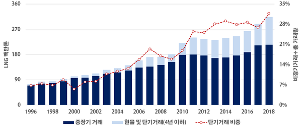 ▲ LNG 단기거래 추이(1996~2018년)국제 LNG 시장에서 초과 공급 상황이 지속되면서 계약 방식이 점차 유연해지고 있는 것으로 나타났다.