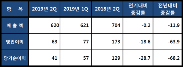후성의 2019년 2분기 경영실적이 반도체, 디스플레이, 2차전지, 냉매 시장 등 전방산업의 침체로 인해 지난해 대비 저조한 실적을 거뒀다.