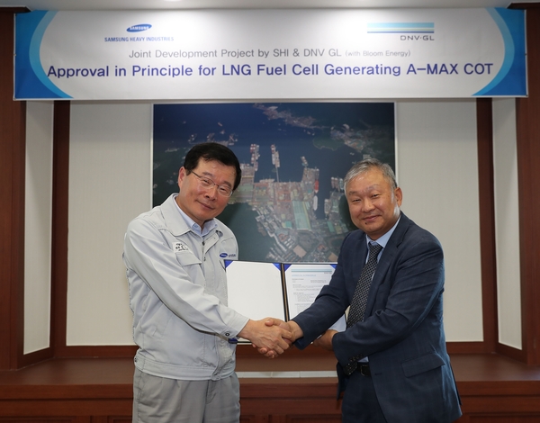삼성중공업은 노르웨이 독일 선급인 DNV GL로부터 ‘연료전지(Fuel Cell) 적용 아프라막스급 원유운반선’에 대한 기본승인을 획득했다고 26일 밝혔다. 선급 기본승인은 선박 기본설계의 기술적 정합성을 검증하는 절차로, 해당 선박과 기술에 대한 공식 인증을 받으면 본격적인 수주 활동이 가능함을 의미한다.