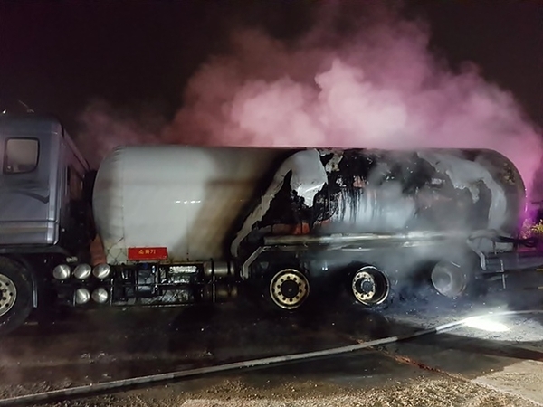 ▲ 액화탄산 탱크로리 화재현장(사진 : 전주덕진소방서)액화탄산가스를 가득 실은 탱크로리가 화재가 발생했으나 인명피해 없이 진화됐다.