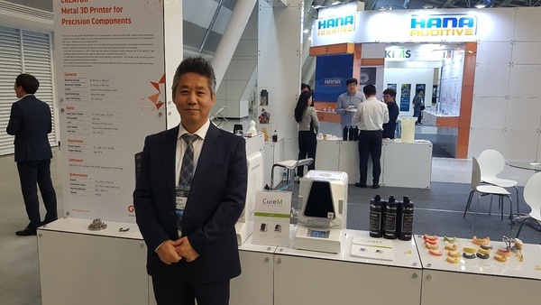 ▲ 심운섭 그래피 대표가 덴탈 등에 공급되고 있는 3D프린팅용 고기능 광경화수지를 소개하고 있다.