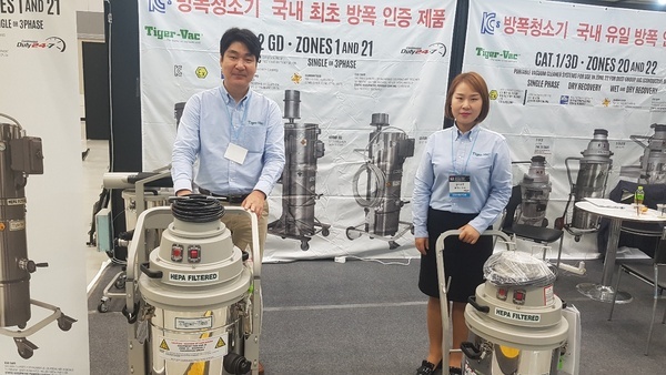 ▲ (유)월드마켓 윤기숙 대표(右)가 타이거-백(TIGER-VAC)社의 방폭 청소기를 소개하고 있다.