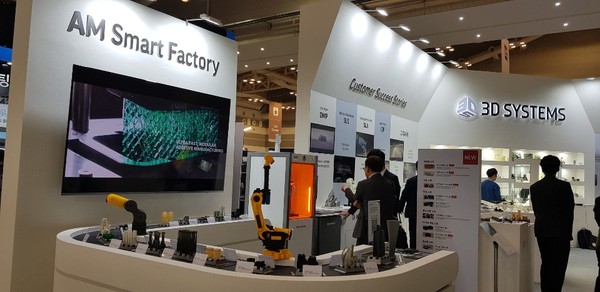 ▲ 부품 양산을 위한 적층제조 스마트팩토리가 날로 발전하고 있다. 3D시스템즈는 스마트팩토리 솔루션을 전면에 내세웠다. 국내 최대·유일 산업용 적층제조(3D프린팅) 전문전시회인 ‘TCT 코리아(KOREA) 2019’에서는 소재, 장비, S/W, 서비스, 후공정 등 부품 양산에 필요한 솔루션이 중점 소개됐으며 대한민국에서도 적층제조시대에 필요한 밸류체인이 구축되고 발전하고 있음을 확인할 수 있었다. 국내 군수, 자동차, 기계, 등 제조업의 중심지 경남 창원에서 개최되다 보니 전시 업체와 참관객 모두 시제품 제작에 필요한 장비, 소재 등에 관심을 갖는 것에서 벗어나 제조공정 혁신을 위한 솔루션을 공유하는 자리가 됐다는 평가다.
