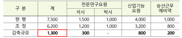 이번에 개선된 제도는 현재 박사과정을 수료하면서 전문연구요원 편입을 준비하고 있는 학생들에게 피해가 없도록 2023년 박사과정 전문연구요원 편입인원부터 적용된다. 전문연구요원(석사), 산업기능요원, 승선근무예비역은 배정인원의 20%인 1,300명을 5년(2022~2026년)에 걸쳐 단계적으로 감축된다.