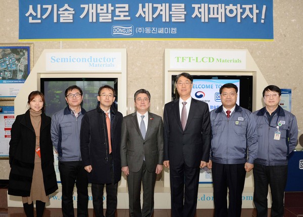 ▲ 정승일 산업부 차관(中)이 동진쎄미켐을 방문해 생산현장을 둘러보고 애로사항을 청취했다.