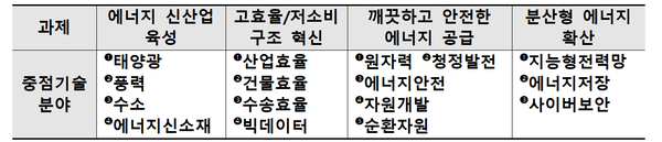 산업부의 올해 에너지 기술개발 추진 방향 에너지전환과 에너지산업 생태계 변화를 뒷받침하기 위해 16대 중점기술 분야를 집중 육성하는데 있다. 이에 수소(431억원), 원자력(270억원), 산업효율(176억원), 에너지안전(165억원), 에너지저장(143억원), 수송효율(137억원), 태양광(110억원), 풍력(93억원) 등 신규과제의 95%인 1,928억원의 예산이 투입된다.