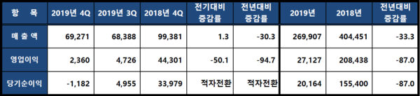 2019년 4분기 매출은 연결기준으로 6조9,271억원을 기록해 전년동기대비 30.3% 감소했고, 영업이익은 2,360억원을 기록해 전년동기대비 94.7% 감소했다. 당기순이익은 1,182억원의 적자를 기록했다.