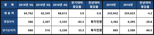2019년 4분기 경영실적은 연결기준으로 매출은 6조4,762억원을 기록해 전년동기대비 5.6% 감소했고, 영업이익은 386억원으로 전년동기대비 흑자전환됐다. 당기순이익은 688억원으로 전년동기대비 흑자전환됐다.