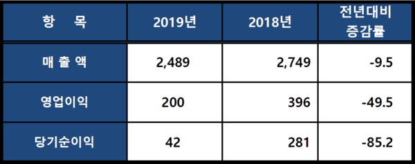 연결재무제표 기준으로 2019년 매출은 2,489억원으로 전년대비 9.5% 감소했고, 영업이익은 200억원으로 전년대비 49.5% 감소했다. 당기순이익은 42억원으로 전년대비 85.2% 감소했다.