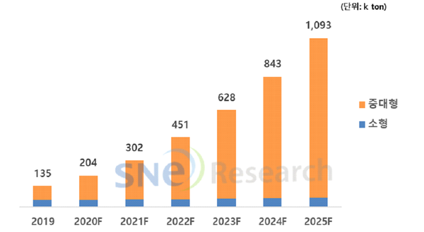 ▲ 이차전지 전해액 수요 전망(자료:SNE리서치)전기차 시장 확대로 리튬이온 이차전지(LIB)의 주요 소재인 전해액 수요가 중대형용을 중심으로 급격히 성장할 전망이다.