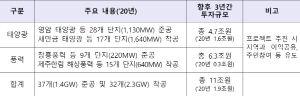 ▲ 태양광·풍력 대규모 프로젝트 현황정부가 3년간 11조원이 투자되는 32개 대규모 재생에너지 프로젝트를 연내 착공하는 등 올해 흔들림 없는 신재생에너지 확대를 추진한다.