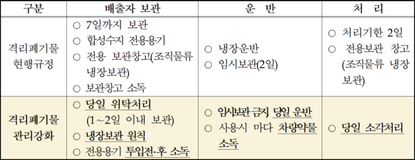 ▲ 현행규정보다 강화된 코로나-19 격리의료폐기물 관리방안정부가 코로나19 확진자로부터 발생하는 폐기물은 당일 소각처리하고, 지정폐기물 처리계획의 확인 등 관련 행정사항은 절차 간소화와 사후처리를 허용하는 등 신속하고 차질없는 안전관리에 나선다.