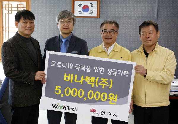 전주시는 11일 전주지역 대표 탄소기업인 비나텍(대표이사 성도경)이 코로나19 확산으로 인해 어려움을 겪는 취약계층을 위한 성금 500만원을 기탁했다고 밝혔다.