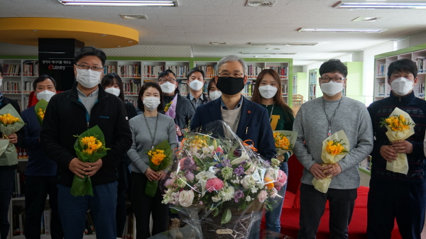 코로나19 심각단계로 대부분의 직원들이 재택근무를 하는 상황에도 매일 출근해 건물 내 방역과 재택근무를 지원하는 직원들에게 격려의 꽃을 선물하며 릴레이 캠페인을 전개했다.