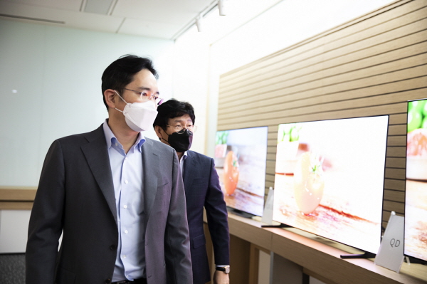 ▲ 이재용 삼성전자 부회장이 삼성디스플레이를 방문해 QD(퀀텀닷) 디스플레이를 살펴보고 있다.이재용 삼성전자 부회장이 디스플레이 사업장을 돌아보고 위기 극복과 미래사업에 만전을 기했다.