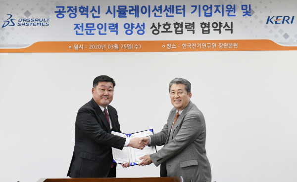 과학기술정보통신부 국가과학기술연구회 산하 전기전문 정부출연연구기관인 한국전기연구원(KERI, 원장 최규하)이 세계적인 소프트웨어 기업인 ‘다쏘시스템코리아(대표이사 조영빈)’와 ‘공정 혁신 시뮬레이션 센터’ 플랫폼 구축을 통해 중소기업 제품 경쟁력 확보에 나선다.