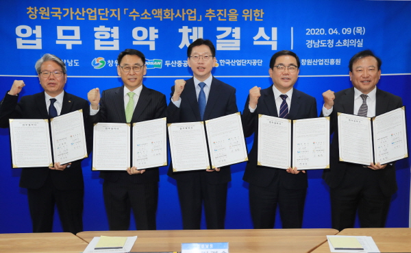 경상남도(도지사 김경수)는 9일 도청 소회의실에서 ‘수소액화 실증 플랜트 구축사업’을 위한 산업단지 환경개선펀드 투자사업의 성공적 추진과 상호간의 협력을 증진하기 위한 업무 협약을 체결했다.