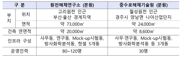 산업부의 원전해체연구소 설립 추진계획에 따르면, 경수로 해체를 연구하는 본원은 부산과 울산 접경지역에 약 7만3천㎡ 규모로 건설될 예정이다. 중수로 해체를 연구하는 분원은 경주시 나아산업단지에 약 2만4천㎡ 규모로 조성된다.