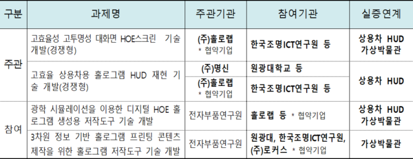 홀로그램 핵심기술개발은 지난해 6월 홀로그램 예비타당성조사를 통과한 사업으로 금년 1월부터 기술개발분야 15개 과제에 대해 공모해 이번에 최종 선정됐다.