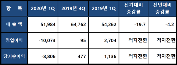 ▲ S-Oil 2020년 1분기 경영실적(연결재무제표기준, 단위 : 억원,%)S-Oil(에쓰-오일)이 2020년 1분기 유가 하락 및 코로나19 확산으로 인한 정제 마진 약세의 영향으로 약 1조원의 영업손실을 기록했다.