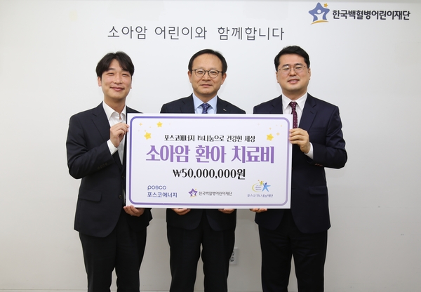 포스코에너지는 28일 정기섭 포스코에너지 사장과 직원 대표인 황석현 에너지협의회 의장이 함께 성북동에 위치한 한국백혈병어린이재단을 찾아 소아암 환아를 위한 치료비 5천만원을 전달했다.