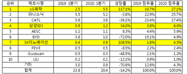 SNE리서치에 따르면 1분기 전세계에 판매된 전기차(EV, PHEV, HEV) 탑재 배터리 사용량 순위에서 LG화학이 처음으로 1위를 차지했으며 삼성SDI와 SK이노베이션도 각각 4위와 7위를 기록한 것으로 나타났다.