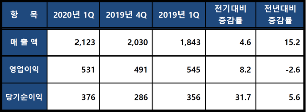 ▲ SK머티리얼즈 2020년 1분기 경영실적(연결재무제표 기준, 단위 : 억원,%)SK머티리얼즈가 2020년 1분기 반도체용 특수가스 판매 증가와 자회사들의 실적호조로 실적이 증가했다.