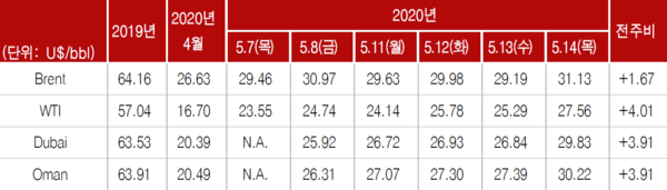 한국석유공사 석유동향팀은 15일 ‘유가정보서비스 오피넷’을 통해 ‘2020년 5월 2주 주간 국제유가동향’을 발표했다.