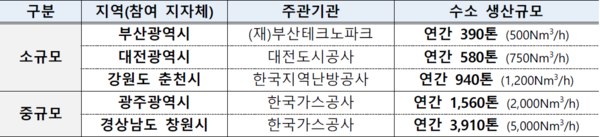 소규모 수소추출시설은 부산광역시, 대전광역시, 강원도 춘천시 총 3개 지역을 선정했으며, 중규모 수소추출시설은 광주광역시, 경남도 창원시 총 2개 지역을 선정했다.