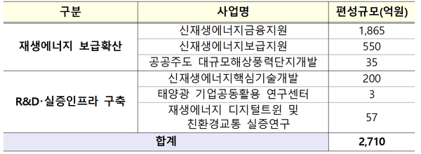 산업부는 제3차 추경예산안이 지난 3일 국회심의를 통과함에 따라 태양광, 풍력 등 6개 재생에너지 사업에 총 2,710억원의 예산을 추가로 투자한다고 지난 5일 밝혔다.