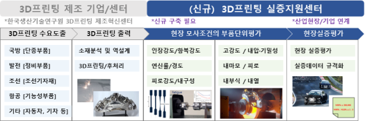 3D프린팅은 그간 플라스틱 소비재, 시제품 제작 등 많이 활용이 돼왔으나, 금속과 같은 고부가가치 부품 등의 경우 품질 평가가 충분히 이뤄지지 못해 신뢰도가 낮아 사업화나 현장적용으로 이어지지 못하는 상황이다. 때문에 시제품제작에 이은 시편단위 평가-부품단위 평가-현장모사 평가까지 지원할 수 있는 인프라 구축이 요구돼 왔다.