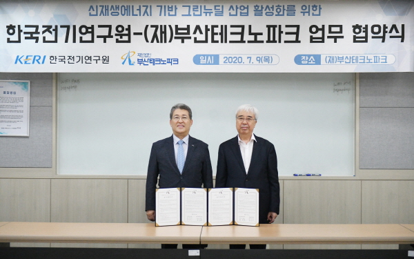 과학기술정보통신부 국가과학기술연구회 산하 전기전문 연구기관인 한국전기연구원(KERI, 원장 최규하)이 부산테크노파크(원장 최종열)와 태양광 발전소 및 항만형 분산전원 구축 등 대형 뉴딜산업의 친환경성 제고를 위해 손을 맞잡았다.