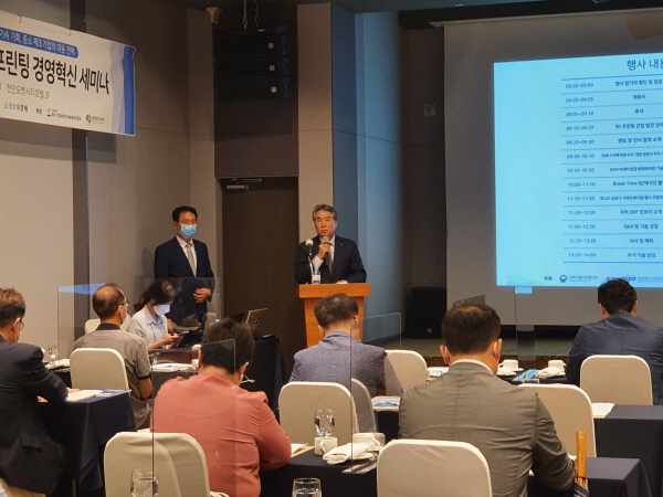 ▲ 조창현 중소기업융합 대전세종충남연합회 회장이 ‘중소기업 최고 CEO 3D프린팅 경영혁신 세미나’에서 축사를 통해 중소기업의 신기술 교류를 강조했다.조창현 중소기업융합 대전세종충남연합회 회장(가스켐테크놀로지 대표이사)이 포스트 코로나 시대 중소기업 대응이 중요하다며 제조업 신기술 교류가 활발하게 이뤄져야 한다고 밝혔다.