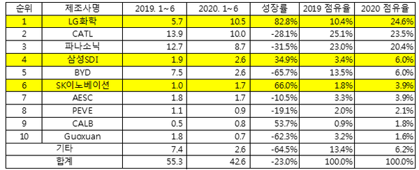 6월 글로벌 전기차 배터리 사용량은 10.1GWh로 전년동기대비 20.3% 감소했다. 신종 코로나 사태가 장기화되면서 미국과 중국 시장 모두 침체에서 벗어나지 못했다. 이에 따라 대부분의 해외 업체들이 역성장으로 접어들었으나 국내 3사와 CALB는 두 자릿수 이상의 급성장했다.